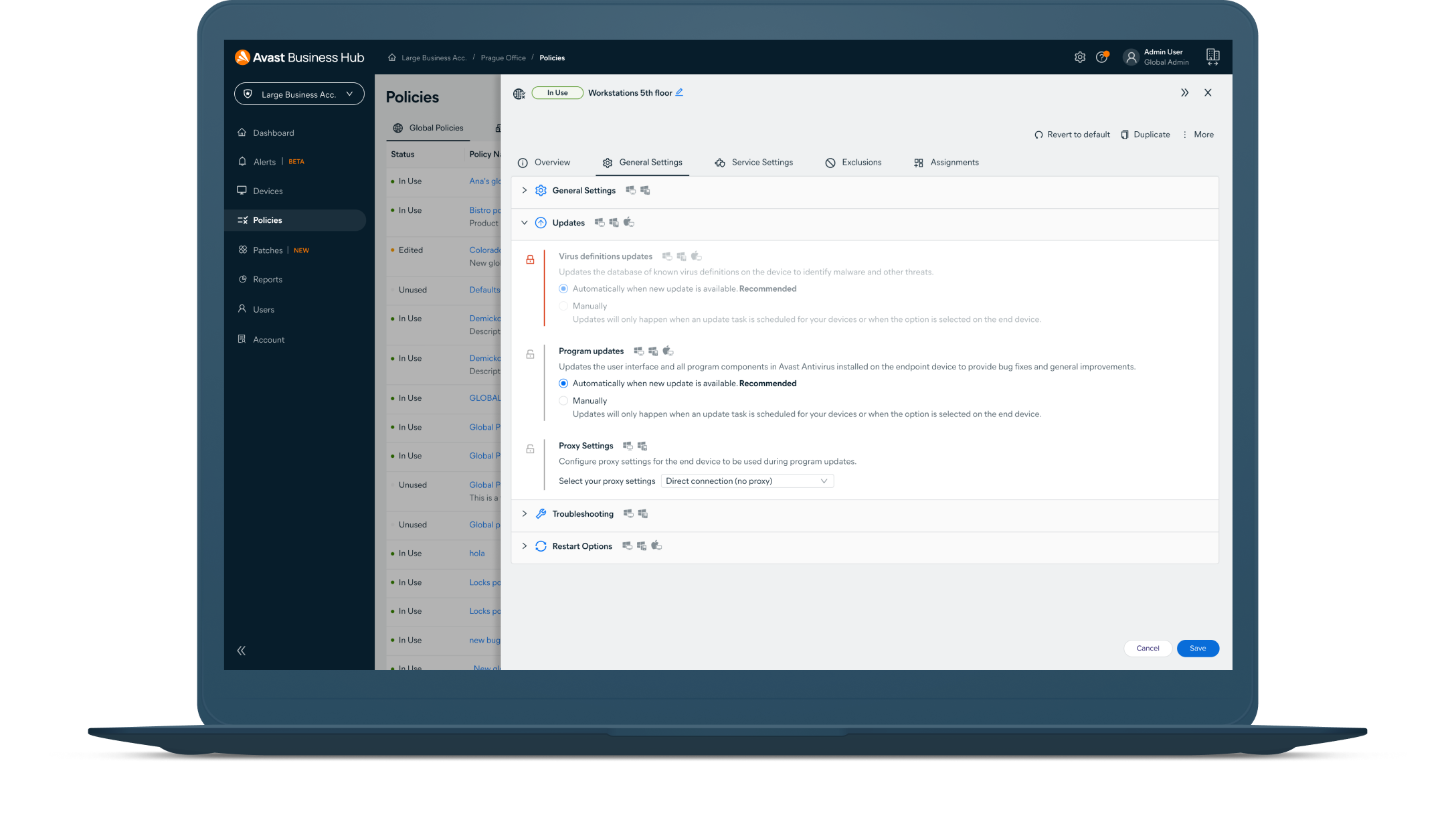 ビジネス ハブですべてのデバイスのセキュリティを管理します。ポリシーが変更されると、エージェントの管理下にあるデバイスでリアルタイムに自動設定されるため、メンテナンスにかかる手間が軽減し、業務拡張が容易になります。