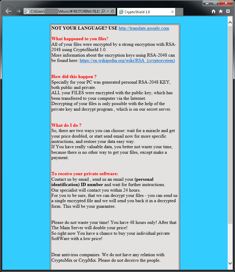 1 つ以上の暗号化されたファイルを含む各フォルダ内で、Help Restore Your Files.txt を次のコンテンツで見つけることができます。