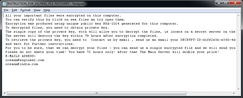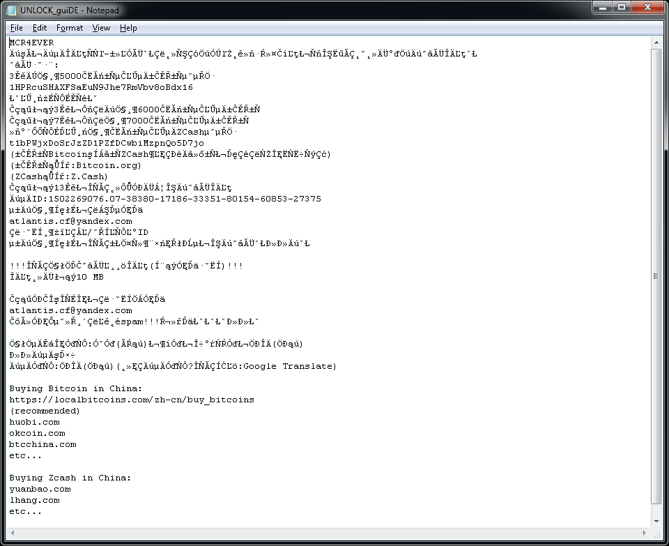 このランサムウェアは、ユーザーのデスクトップに「UNLOCK_guiDE.txt」という名前のテキスト ファイルも作成します。ファイルの内容は以下のとおりです。